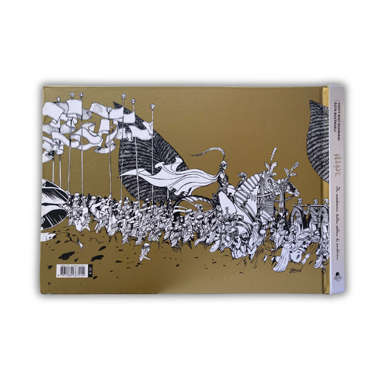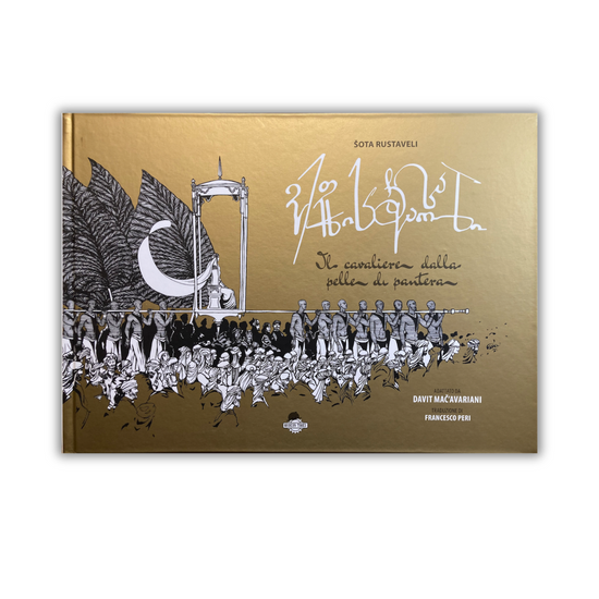 Due coppie di amanti sublimi e un terzetto di compagni d’armi agiscono in un mondo di fiabeschi reami orientali per riunire Nestan-Darejan al suo promesso Tariel, l’ombroso guerriero dal manto di pelliccia. Un’esotica visione di sfarzo, avventure e passioni smisurate che le tavole di David Matchavariani, autentico tour de force, reinventano e oggettivano nel medium esigente della china.